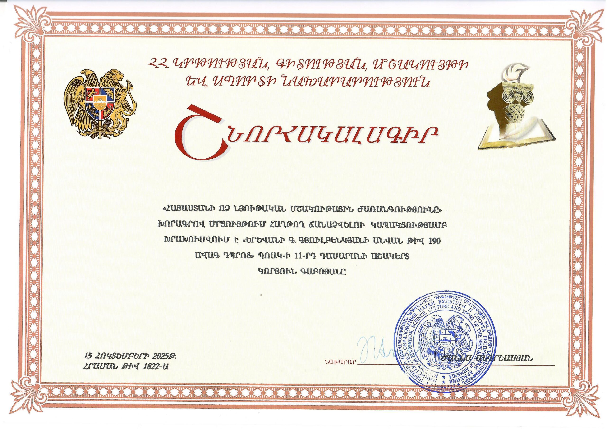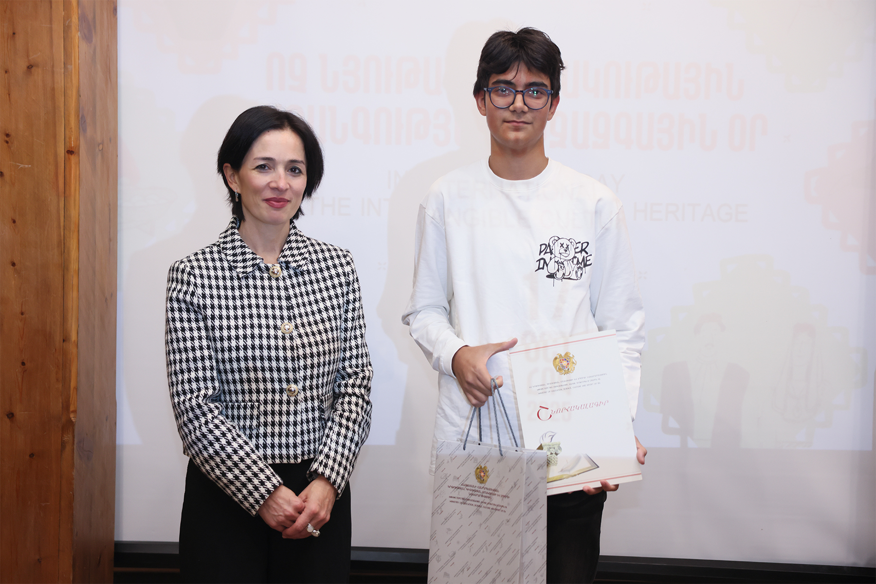ԿԳՄՍ նախարար Ժաննա Անդրեասյանն այսօր հաղթող աշակերտներին հանձնել է շնորհակալագրեր և խրախուսական նվերներ: Միջոցառումը տեղի է ունեցել Հովհաննես Շարամբեյանի անվան ժողովրդական արվեստների թանգարանում: